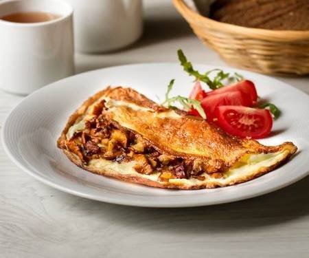 Для приготовления 1 порции деревенского омлета с лисичками и луком возьмите: