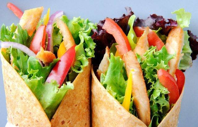 Нарежьте овощи. Разложите лаваш, намажьте его соусом и сверху выложите овощи. Выложите куриную грудку. Аккуратно сверните лаваш в трубочку и обжарьте на раскаленной сковородке-гриль. Сразу же подавайте!