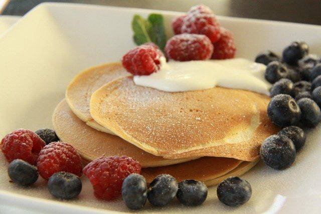 Все ингредиенты перемешать в блендере. Если будет недостаточно жидкости – добавьте еще яичных белков. Выпекать на сковороде с антипригарным покрытием без масла. Подавать с ягодами.