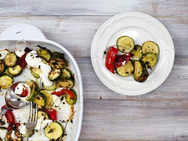 Обваляйте кружки кабачка в муке и обжаривайте на другой сковородке. После того, как кабачки приобретут золотистый оттенок со всех сторон, добавьте к ним перец и помидоры и тушите еще 5 минут. Кабачки по-гречески готовы.
