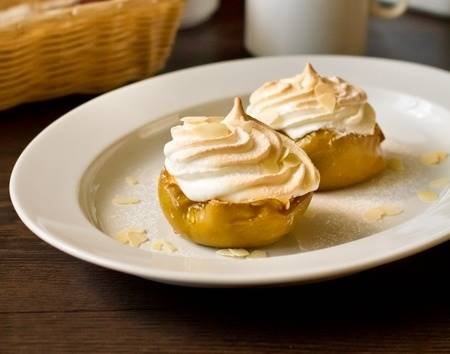 Достаньте форму из духовки и на каждое яблоко положите меренгу.