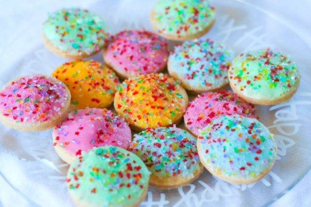 Взбить масло с сахаром, добавить миндальный экстракт. Взбивать массу, постепенно добавляя муку. Скатайте тесто в шар, отправьте в холодильник на 30 минут. Раскатайте тесто на посыпанной мукой поверхности. Круглой формочкой сделайте печенья. Выстелите противень пергаментом. Отправьте печеньки в холодильник на 10 минут – это поможет им сохранить форму во время выпекания. Выпекайте 15-20 минут при 165 градусах до тех пор пока края печенья не подрумянятся.