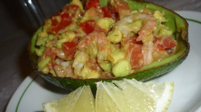 Нарежьте помидоры и мякоть авокадо средними кубиками. Добавьте очищенные креветки. Поперчите, посолите, добавьте лимонный сок и мелко нарезанный чеснок.