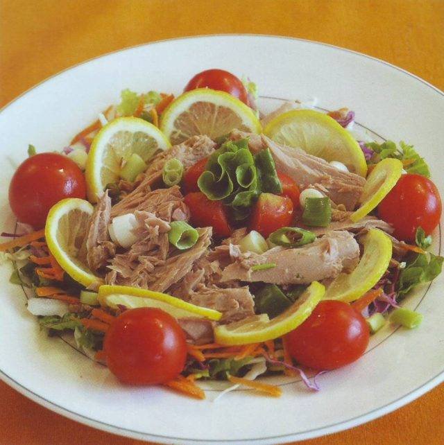 Листья зеленого салата нарезать тонкими полосками, лук зеленый нарезать мелко, мясо, помидоры – кубиками. Хорошо все перемешать и заправить приготовленным заранее соусом из растительного масла, горчицы, уксуса и соли. Полученную смесь выложить в блюдо, украсив дольками лимона.