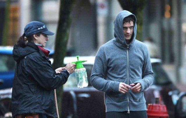 Джейми Дорнан заставляет нас растаять с помощью своей очаровательной улыбки во время съемок сцен для своего фильма “Пятьдесят оттенков серого” в среду (29 января) в Ванкувере, Канада.