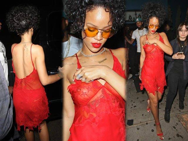 Рианна любит ходить полуголой, поэтому ее выбор пал на красное прозрачное платье, на девушке были трусики такого же цвета, а вот бюстгальтер отсутствовал. звезду это никак не смущало, она просто веселилась до утра, а потом накинула на плечи пиджак и направилась к автомобилю.