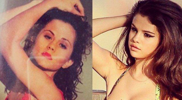 В левой части фотографии изображена мама звезды Мэнди Тифи позирующая в красном платье, а в левой части сама Селена в точно такой же позе. Глядя на фотографию сомневаться не приходиться что перед нами мама и дочь.