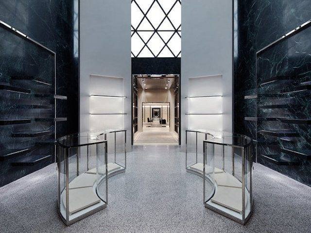 Интерьер двухэтажного бутика еще не окончен до конца, но в сети уже появились его первые фото. Помещение достаточно просторное, облицованное гладким мрамором, сорта Verde Ramegiatto (зеленый с искрой). Достаточно часто, такой используют для интерьера в музеях. Ванг попытался объединить новое и старое, что бы создать вневременное пространство.
