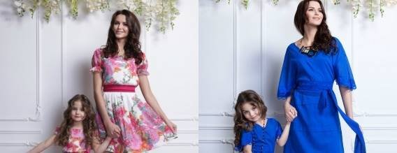 Дизайнер уверен, что девочки всегда хотят быть похожими на маму, такими же красивыми. Таким образом, родилась идея создать платья одного силуэта. Наряды выполнены из шелкового батиста. Здесь можно встретить, как однотонные наряды, так и с яркими принтами.